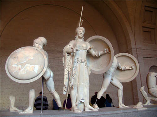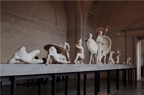 爱法伊娥神殿上的大理石雕塑,由东西两面的三角墙组成。巴伐利亚国王路德维希一世(LUDWIG I)曾邀请丹麦新古典主义雕塑家伯特尔·特尔瓦德逊(Bertel Thorvaldsen)对其进行修复。每组雕塑都以中间的人物雅典娜为中心,主题是描述埃伊那岛英雄们在第一、第二次与特洛伊人的战争中英勇抗击的场景。