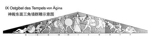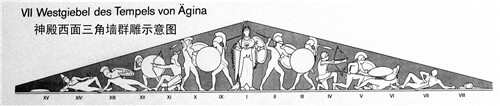 东面三角墙的群雕,构图上依旧将战神雅典娜放到中间,两边是战斗着的勇士。由于战争中缺少了巨人及亚马逊女战士,可以推算出这组表现希腊人与特洛伊人之间的战争,并非《荷马史诗》中所提及的那场战争,而是阿波洛道鲁斯(Apollodorus)[11]等人在文献中提及的埃伊那岛的祖先们充当重要角色的战争。