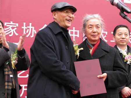 中国雕塑学会会长曾成钢为全国城市雕塑建设指导委员会原代主任王克庆先生颁发中国雕塑终身成就奖(王克庆先生的夫人代领)